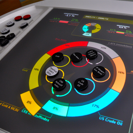 Die Finanzwelt entdecken. Um Menschen den Einstieg in die komplexe Welt der Finanzanlage zu erleichtern, müssen sie selbst zu Playern werden. Wir haben dafür den Portfolio Simulator entwickelt: Die User stellen damit mit Spielsteinen ein diversifiziertes Finanz-Portfolio zusammen. Auf einem mitdenkenden, interaktiven Multitouch-Screen, der verständliche Antworten auf einfache Fragen gibt.